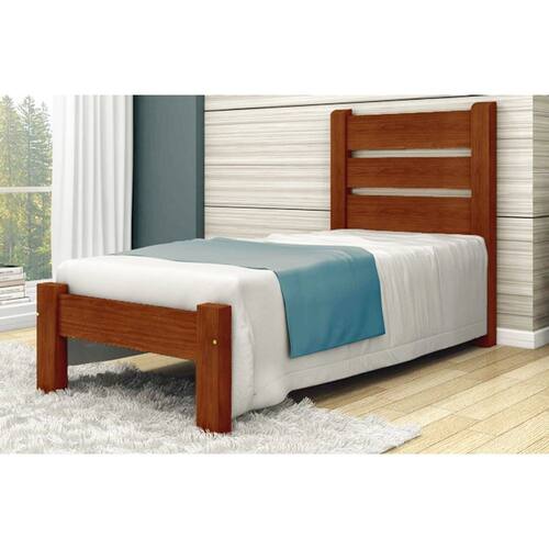 DESCRIÇÃO: Altura cabeceira: 117 cm Largura: 90 cm Comprimento: 190 cm Espaço entre o chão e o estrado: 26 cm (Aproximadamente) Peso suportado: 200 kg Ideal colchões de medidas: 88 X 188 cm Material Utilizado: Cabeceira e Peseira: Madeira Maciça Tauari Laterais: Laminado Naval de Alta Resistência Sarrafos: Madeira Tauari Ripas: Madeira Pinus Suportes: Plástico.