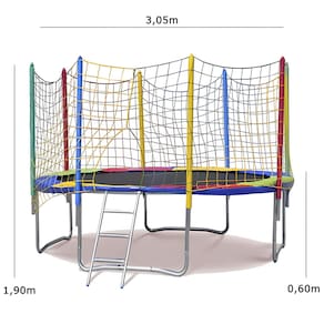 CAMA ELÁSTICA 3,05m MEDIDAS (VALORES APROXIMADOS): Diâmetro total: 3,05m Altura total: 1,90m Altura do chão a lona: 60cm ESPECIFICAÇÕES: Estrutura em aço galvanizado; Acessórios com proteção UV; Sistema de impulsão por 64 molas; 4 pés em formato de U; Rede de proteção em polipropileno; Sistema de montagem do trampolim por encaixe; Suporta até 150 kg; Lona de salto; Protetor de Molas Escada.