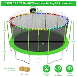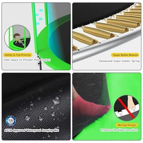 SEGURANÇA GARANTIDA A rede do gabinete de segurança está perfeitamente presa ao aço elimina o risco de prender as mãos ou os pés das crianças nas lacunas. Todos os postes de pé são acolchoados com tubos de espuma azul, evitando efetivamente que as crianças se machuquem ao cair nos postes da rede. Além disso, as molas são todas cobertas com uma almofada grossa e durável e expandiu a área de salto. ESTÁVEL E DE LONGA DURAÇÃO O trampolim de quintal possui estrutura de aço galvanizado por imersão a quente, que é 5 vezes mais longa que a galvanização comum. Um total de 6 pernas em forma de U para maior estabilidade. Os postes de pé são envoltos em estofamento à prova de intempéries que podem ser deixados ao sol sem medo e para uso a longo prazo. SALTAR COM FACILIDADE Fortes molas galvanizadas prendem com segurança a esteira e a estrutura de salto firmemente tecidas, oferecendo um salto superior e melhor. A rede de cerco de 6 pés de altura feita de PE ambiental garante segurança e rapidez absolutas ao pular. Capacidade máxima de peso 680 kg. BASKETBALL HOOPLADDER A escada de 3 degraus apresenta um espaço menor entre elas para uma escalada conveniente para crianças mais novas. A cesta de basquete flexível feita de material resistente às intempéries que não será facilmente danificada. E também vem com uma bomba de basquete e ar, que pode trazer uma infância feliz para seus filhos Marca: Não Informado