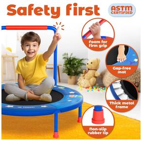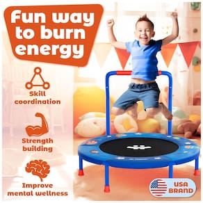 Incentive a atividade física dos seus filhos desde cedo com o mini trampolim infantil 36 da Happin Este modelo possui um corrimão para auxiliar as crianças menores a começarem a pular, podendo ser removido à medida que elas ficam mais experientes no trampolim. Projetado para ser silencioso, este trampolim interno é perfeito para proporcionar horas de diversão e brincadeiras imaginativas em segurança, com acolchoamento de mola de 1,5 de espessura. Além disso, este pequeno trampolim para crianças é versátil, podendo ser utilizado tanto dentro quanto fora de casa. O mini trampolim infantil é um excelente presente para crianças em idade pré escolar e infantil, sendo fácil de montar e armazenar. Com este trampolim interno para crianças, você pode desfrutar de horas de brincadeiras ativas, dentro ou fora de casa. Faça seu pedido agora e veja o rosto do seu filho se iluminar de alegria