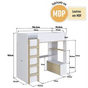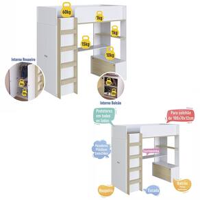 Cama Elevada Multifuncional com Armário e Escrivaninha BI030 Linha Infanto Branco Carvalho Araguaia Completa Móveis