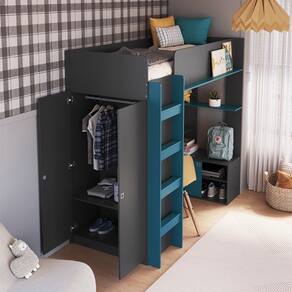 Cama Elevada Multifuncional com Armário e Escrivaninha BI030 Linha Infanto Grafite Azul Secreto Completa Móveis