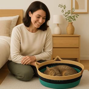 Cama Gato Ninho Cesto Arranhador Pet Felino Lavável Confortável Cama Gato Ninho Cesto Arranhador Pet Felino Lavável Confortável Cama de Gato Tipo Cestinho com Orelhinhas - Arranhador, Lavável e Confortável Design Divertido e Resistente Aposte na combinação perfeita de conforto, estilo e funcionalidade com a Caminha de Gato Tipo Cestinho com Orelhinhas Feita com corda de algodão trançada e acabamento em tecido lavável, essa caminha é o espaço ideal para seu pet descansar e rasquear com segurança e diversão. Com formato redondo e detalhe de orelhinhas, ela agrega um toque decorativo ao ambiente, sendo perfeita para gatos de todas as idades. Portátil, resistente e multiuso, pode ser Utilizado com ou sem almofada adicional. Além de confortável, também funciona como um arranhador natural, ajudando a manter as garras do seu bichinho saudáveis. Benefícios do Produto: Design divertido com orelhinhas de gato Funciona como cama e arranhador Feita com corda de algodão trançada e linho resistente Lavável e fácil de limpar Estável, confortável e decorativa Pode ser Utilizado com ou sem almofada adicional Ideal para gatos e pequenos pets Especificações Técnicas: Cor: Bege e Azul Material: Corda de algodão + linho Altura: 13 cm Diâmetro: 45 cm Circunferência: 1,40 m Conteúdo da Embalagem: 1 Caminha de Gato tipo cestinho com orelhinhas