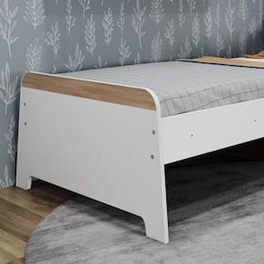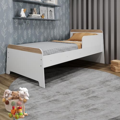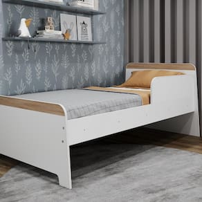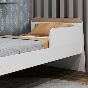 Cama Infantil com Proteção Lateral Lorenza Movelbras Branco/Aveiro. A cama solteiro Lorenza, possui um design diferenciado com detalhe amadeirado e acabamento em perfil PVC soft cabeceira e peseira, proporcionando maior conforto ao toque. Possui uma proteção lateral medindo: 85x24x15 cm, proporcionado maior segurança para a criança. Tamanho indicado de colchão: 188x88x14cm. Ean: 7909903136188