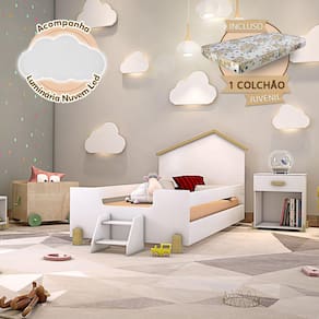 Cama Infantil Montessoriana Com Colchão E Escadinha Juvenil Ayla Branca E Natural + Luminária A Cama Ayla é produzida pensando no desenvolvimento da criatividade das crianças, a cama possui um design em formato de casinha e um estilo montessoriano, no qual deixa o colchão mais próximo do chão trazendo segurança para o seu pequeno. Fabricado em material MDF e com pés em madeira maciça o produto tem resistência e durabilidade no qual a criança precisa.