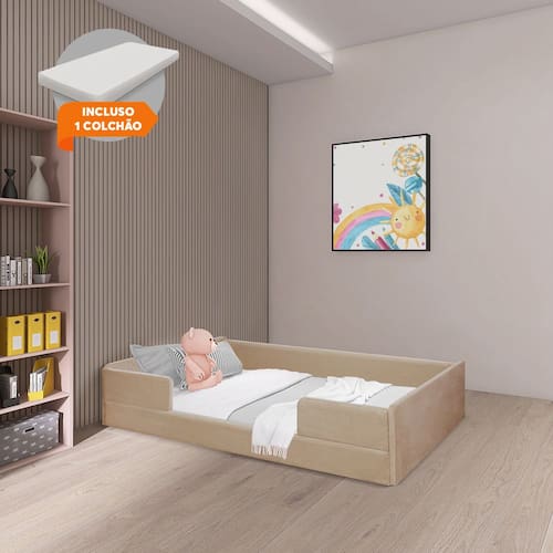 Cama Infantil Montessoriana com Colchão Luana em Madeira Maciça com Revestimento em Tecido Bege