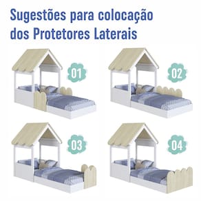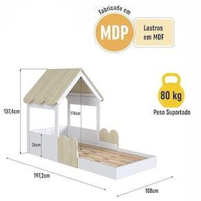 Características Estrutura Modelo Casinha em MDP Acabamento Fosco Protetores Laterais Móveis que Permitem Serem Movimentadas ou Trocadas de Posição Telhadinho com cantos arredondados Estrado Lastros em MDF cru Suporta até 80 kg sem Impacto IDEAL PARA COLCHÃO 188 X 78cm NÃO ACOMPANHA COLCHÃO