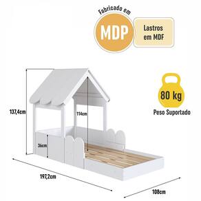 Características Estrutura Modelo Casinha em MDP Acabamento Fosco Protetores Laterais Móveis que Permitem Serem Movimentadas ou Trocadas de Posição Telhadinho com cantos arredondados Estrado Lastros em MDF cru Suporta até 80 kg sem Impacto IDEAL PARA COLCHÃO 188 X 78cm NÃO ACOMPANHA COLCHÃO
