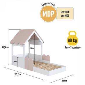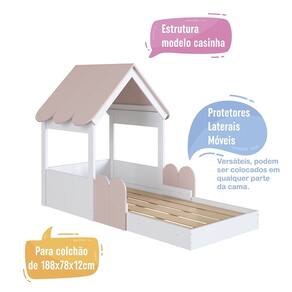 Características Estrutura Modelo Casinha em MDP Acabamento Fosco Protetores Laterais Móveis que Permitem Serem Movimentadas ou Trocadas de Posição Telhadinho com cantos arredondados Estrado Lastros em MDF cru Suporta até 80 kg sem Impacto IDEAL PARA COLCHÃO 188 X 78cm NÃO ACOMPANHA COLCHÃO