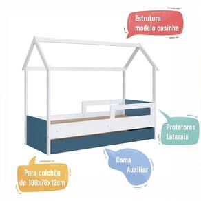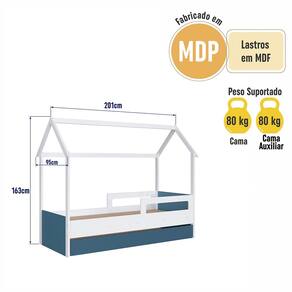 Características Estrutura Modelo Casinha em MDP Acabamento Fosco Protetores Laterais Estrado Lastros em MDF cru Sapatas Plásticas Cama Auxiliar com 04 Rodízios Metálicos Suporta até 80 kg sem Impacto cada Cama IDEAL PARA COLCHÃO 188 X 78cm NÃO ACOMPANHA COLCHÃO