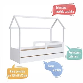 Características Estrutura Modelo Casinha em MDP Acabamento Fosco Protetores Laterais Estrado Lastros em MDF cru Sapatas Plásticas Cama Auxiliar com 04 Rodízios Metálicos Suporta até 80 kg sem Impacto cada Cama IDEAL PARA COLCHÃO 188 X 78cm NÃO ACOMPANHA COLCHÃO