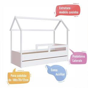 Características Estrutura Modelo Casinha em MDP Acabamento Fosco Protetores Laterais Estrado Lastros em MDF cru Sapatas Plásticas Cama Auxiliar com 04 Rodízios Metálicos Suporta até 80 kg sem Impacto cada Cama IDEAL PARA COLCHÃO 188 X 78cm NÃO ACOMPANHA COLCHÃO