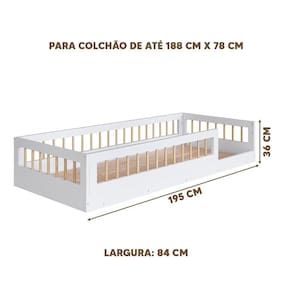 Dimensões da cama: Largura 84 cm; Profundidade 195 cm; Altura 36 cm.