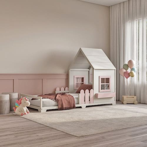 Transforme o quarto dos pequenos em um verdadeiro refúgio de sonhos! A Cama Mariana encanta com seu formato de meia casinha, trazendo duas janelinhas delicadas e uma charmosa floreira, ideal para flores ou os brinquedos preferidos da criança.