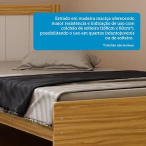 A Cama Infantil Solteiro Manu une segurança e charme para o quarto das crianças. Fabricada em MDF com pintura UV atóxica, possui bordas laqueadas, pés em MDF e estrado de madeira resistente. Ideal para colchão de 188 x 88 cm (não incluso), é uma opção funcional e acolhedora para o dia a dia.
