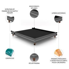 Essa Cama Estofada é fabricada com madeira reflorestada utilizando materiais como pinus, eucalipto e chapas de MDF 6mm, é tratada contra mofo, cupins e micro-organismos, oferecendo máxima resistência e durabilidade. O revestimento lateral aliado à espuma D-20 da Cama Casal, possuem acabamento impecável e exalam sofisticação, deixando o ambiente moderno e aconchegante. Seu design bipartido facilita tanto o quanto a montagem, enquanto o travamento da estrutura reforçado com grampos aplicados por grampeadores pneumáticos e os pés em madeira asseguram estabilidade e uma vida útil prolongada.