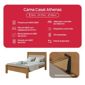 Características: Produto em MDF/MDP; Pintura U.V. e acabamento em micro textura; Cor branca com acabamento U.V. alto brilho; Barra lateral em MDF de 25mm; Pés maciços em MDF de 74mm; Painéis da peseira e da cabeceira em MDF de 15mm; Estrados em MDF de 6mm. Vantagens/Benefícios: Produzido com equipamentos de alta tecnologia; Produto avaliado e aprovado por um rigoroso controle de qualidade; Fácil montagem e manual de montagem simplificado; Acabamento com toque aveludado; Tamanho ideal para colchões de 1380mm; Estrutura firme e robusta, suportando até 160kg; Cabeceira com detalhes frisados; Cinco travessões no estrado que trazem mais segurança; Dispositivo antirruído nos travessões; Pés maciços que trazem mais robustez e segurança. A Cama Casal Athenas possui uma cabeceira alta, dando a sensação de amplitude ao ambiente. Confeccionada com materiais de alta qualidade e resistência, ela terá uma vida útil mais longa e ainda ajudará a decorar seu dormitório com graça e charme.