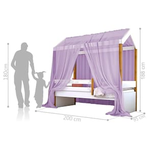 Cama acompanha grade lateral de proteção, voal, e colchão de solteiro na medida de 88x188 cm.