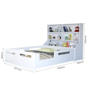 Ideal para quartos infantis, especialmente para pais que adotam o método Montessori na educação dos filhos. Pode ser utilizada para dormir, brincar e organizar brinquedos ou livros, graças à estante e ao baú integrados.