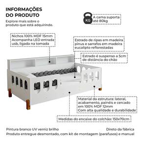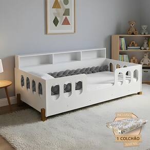 O modelo conta com design lúdico e funcional, ideal para compor quartos infantis acolhedores e organizados. A cama possui proteção lateral vazada, que auxilia na segurança durante o sono, além de nichos superiores que ajudam na organização de livros, brinquedos e objetos decorativos. O conjunto acompanha colchão, travesseiro bordado bem estofado e trança protetora, oferecendo praticidade e um visual harmonioso ao ambiente.