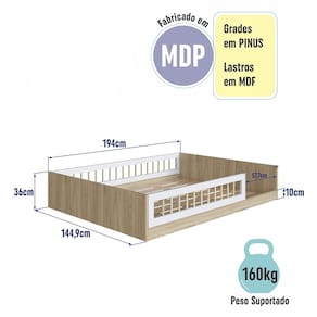 Características Estrutura em MDP Acabamento Fosco Estrado Lastros em MDF cru Grades em Pinus Protetor com Montagem Direita / Esquerda Cantoneiras de Proteção em Silicone Suporta até 160 kg sem Impacto IDEAL PARA COLCHÃO 188 X 78cm NÃO ACOMPANHA COLCHÃO