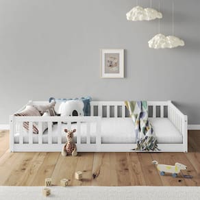 A Cama infantil montessoriana, com proteção lateral, estrategicamente projetada para promover segurança e estimular a independência e autoconfiança das crianças. Seu design contemporâneo e próximo ao chão cria um espaço acolhedor, convidativo para a criança explorar e descansar com conforto, enquanto adiciona um toque de luminosidade e pureza à decoração do ambiente.