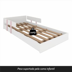 Detalhes Técnicos: MDF 18mm Acabamento: Pintura UV Brilho Borda: PU Apliques em MDF Tonalidade: Branco/Rosa Estrado: em MDF 25mm Peso suportado: suporta até 100kg distribuídos Ideal para colchão Solteiro de 188x88cm Possui colchão: NÃO