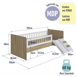Características Estrutura em MDP Acabamento Fosco Estrado Lastros em MDF cru Grades em Pinus Escada e Escorregador com Montagem Direita / Esquerda Protetor com Montagem Direita / Esquerda Suporta até 60 kg sem Impacto IDEAL PARA COLCHÃO 188 X 78cm NÃO ACOMPANHA COLCHÃO