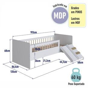 Características Estrutura em MDP Acabamento Fosco Estrado Lastros em MDF cru Grades em Pinus Escada e Escorregador com Montagem Direita / Esquerda Protetor com Montagem Direita / Esquerda Suporta até 60 kg sem Impacto IDEAL PARA COLCHÃO 188 X 78cm NÃO ACOMPANHA COLCHÃO