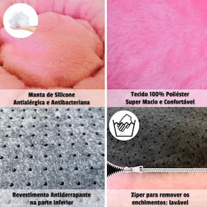 A almofada interna é super macia e o piso possui um revestimento antiderrapante na Parte inferior. O estofamento é preenchido de manta de silicone, sendo antialérgica, antibacteriana e Não se deforma com o uso. É quentinha e confortável.
