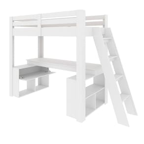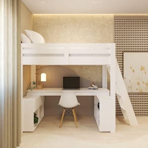 Este móvel multifuncional combina funcionalidade e estilo, proporcionando um ambiente moderno e aconchegante em sua casa, oferece uma escada lateral inclinada, para acesso a cama, uma escrivaninha integrada, perfeita para estudar, ou trabalhar, com conforto e praticidade, além disso, possui duas estantes com nichos e armário com porta basculante, que mantem seus pertences organizados a ao alcance das mãos.