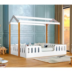 Cama Para Criança Infantil Ágatha Montessoriana Casal Casinha Segura - Branca/Castanho Claro - Branco