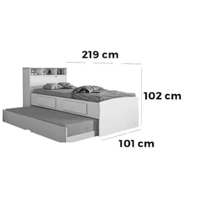Cama Ravena COM Cama Auxiliar Solteiro 2 Gavetas e Baú Conquista A Cama Ravena COM Cama Auxiliar Solteiro 2 Gavetas e Baú Conquista é a solução inteligente para otimizar o espaço do seu quarto. Com um design funcional e moderno, ela oferece muito mais que um lugar para dormir. Suas duas gavetas integradas são perfeitas para guardar roupas de cama, livros ou objetos pessoais, mantendo tudo organizado e acessível. Além disso, conta com um baú espaçoso na cabeceira, ideal para armazenar itens maiores, como cobertores ou almofadas. Fabricada com a qualidade Conquista, a Cama Ravena é a escolha perfeita para um quarto de solteiro prático e bem aproveitado.\nMedidas\nAltura 102 cm\nComprimento 219 cm\nLargura 101 cm\nCaracterísticas\nModelo Cama Ravena COM Cama Auxiliar\nTipo do produto Cama de Solteiro\nFabricante Conquista\nAcompanha Cama Auxiliar Sim\nGarantia 3 Meses\nMaterial MDF/MDP\nIdeal para Colchão 88cm\nAcompanha Colchão Não\nQuantidade de Gavetas 02, Podendo ser colocadas de ambos os lados\nTipo de Corrediça Metálica\nQuantidade de Portas 01\nQuantidade de Nichos 03\nNecessita Montagem Sim\nAcompanha Manual de Instalação Sim\nInformações Importantes\nObjetos decorativos que porventura apareçam na foto, não acompanham o produto. Não nos responsabilizamos pela montagem/instalação dos produtos.\nMontagens, desmontagens e instalações são responsabilidades do cliente. Indicamos que contrate uma empresa de montagem ou um montador de sua confiança.\nAlém disso, favor verificar se os pés e acessórios estão dentro do forro inferior do produto. Em suma, todas as informações divulgadas sobre o produto são de responsabilidade do Fabricante.\nAs cores do produto podem variar de acordo com o seu monitor, a iluminação do ambiente em que você está e até mesmo a sua percepção visual. Além da cor, pequenos detalhes e acabamentos podem não ficar evidentes na foto, por isso as imagens são meramente ilustrativas.
