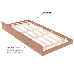Cama Solteiro Com Auxiliar. Torne seu quarto mais bonito e estiloso com este conjunto. Possui estrutura em MDP 15mm e barras laterais com 25mm de espessura, acabamento em pintura UV e partes em BP (Fosco) garante resistência a poeira, riscos e umidade. Possuem estrados resistentes em madeira de eucalipto que suportam até 130 kg distribuídos cada, são ideais para colchão com tamanho padrão solteiro de 0,88 cm (Colchão Não Incluso), a cama auxiliar possui rodízios para facilitar a movimentação. O acabamento é super bonito e de qualidade possibilitando que a cama mantenha-se como nova, por muito mais tempo. Estes móveis chegarão em sua casa separados em 02 volumes.