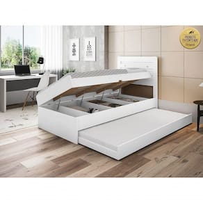 - Possui baú embaixo do estrado. Dimensões: Alt: 22 cm, Larg: 53 cm, Prof: 190 cm