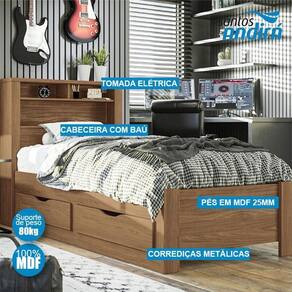 Cama Solteiro com Gavetas Invicta Jatobá: Quer aproveitar cada centímetro do quarto? Essa versão da Invicta tem duas gavetas amplas embaixo da cama, além das prateleiras e do baú na cabeceira, tornando tudo mais organizado. Com acabamento verniz fosco, é prática, bonita e perfeita para quem precisa de espaço extra.