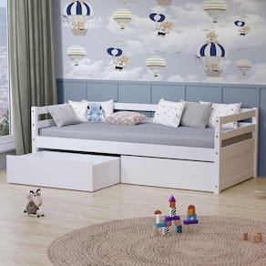 Diferenciais: Cama em Madeira com grade de proteção fixa na parte de trás, 02 Gavetas em Madeira/MDF, Gavetas com Rodízios.