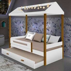 Cama Casa Sara Branco com Cordão de Luzes LED e Cama Auxiliar