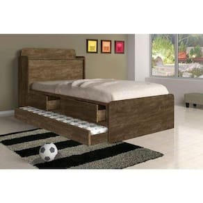 A cama possui baú e gavetas