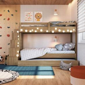 A Cama Treliche Infantil Bicama para Menino e Menina 2,32m com Escada, Nichos e Gavetas da Completa Móveis transforma o quarto da criança em um espaço encantador, com escadas laterais que oferecem praticidade na subida e descida dos pequenos, a cama beliche é perfeita para otimizar o espaço. Cada degrau possui nichos integrados, proporcionando solução inteligente para guardar e organizar brinquedos, livros e outros acessórios. Além disso, os dois últimos são acompanhados por gavetas, tornando o produto ainda mais completo. A Cama Beliche da Completa Móveis oferece a flexibilidade de montar a escada lateral tanto do lado direito quanto do lado esquerdo, adaptando-se às necessidades do ambiente.