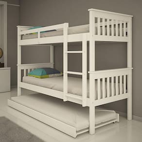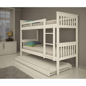 Modelo: Prime B10402 Material: Madeira Maciça de Pinus de Reflorestamento e MDF Pintura/Acabamento: Laca Branco 30% de Brilho , Podendo Aparecer os Veios da Madeira Para Colchões de Dimensões (cm x cm): 188x88 (Não Incluso) Peso Suportado Beliche: 120 Kg por cama Peso Suportado Cama Auxiliar: 120 Kg Acessórios: Escada Fixa e Cama Auxiliar com rodízios
