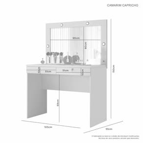 Camarim e Penteadeira Capricho é o produto ideal para te auxiliar no momento da make. Produzido em MDP 15mm, Tampo 25mm, Gavetas com corrediças telescópica, Com chave, Iluminação em LED (inclusa) e Espelho. Pesos e Dimensões Altura do Espelho: 60 cm Largura do Espelho: 90 cm Espessura do Espelho: 3 mm Altura (cm): 150 cm Largura (cm): 105 cm Profundidade (cm): 55 cm Peso (kg): 38.15 kg Materiais e Acabamentos Material Principal: MDP Acabamento: Pintura UV Acabamento da Gaveta: Pintura UV Escala de Brilho: Brilhante Material da Gaveta: MDP Tipo de Corrediça da Gaveta: Metálica Telescópica Montagem Necessita Montagem: Sim Complexidade da Montagem Média: pode ser montado por mais de uma pessoa e/ou necessite de maior conhecimento para montagem Sistema de Montagem: Parafusos e Minifix Recomendações de Uso, Manutenção e Limpeza Pano levemente úmido Características Tipo de Lâmpada: LED Marca: JCM Móveis Suporta Até (kg): 30 kg Possui Portas: Não Possui Pés: Não Possui Iluminação: Sim Fita Integrada: Sim Gaveta com Chave: Não Estilo: Moderno Possui Moldura: Não Possui Porta Objetos: Não Sapatas Niveladoras: Não Formato do Espelho: Quadrado Tipo de Fixação do Espelho: Fita Dupla Face Peso Máximo por Gaveta: 2 kg Tipo de Puxador da Gaveta: Embutido Possui Espelhos: Sim Quantidade de Espelhos: 01 Itens Inclusos Acompanha Banqueta: Não Acompanha Lâmpada: 04 Itens Inclusos: Penteadeira, Kit Ferragens e Manual de Montagem.