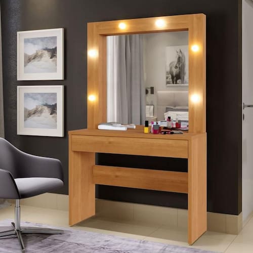 O Camarim Romance é um produto que todos deveriam ter em casa para se embelezar, mas não somente para isso, já que ele possui uma viabilidade enorme, podendo ser utilizado de distintas formas. Ele possui 1 espelho central com 6 lâmpadas de LED que cobre todas as suas laterais e agrega ainda mais charme para esse modelo. Além disso, possui 1 gaveta central com divisórias para maquiagem permitindo a melhor organização de seus objetos na hora de se produzir.