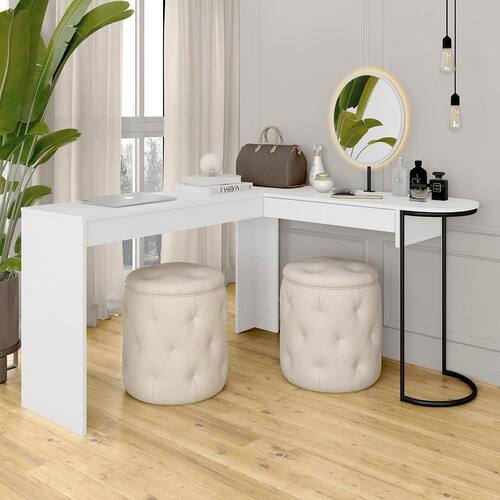 Camarim Industrial em L com Led e espelho Oval Mavi é uma peça versátil e elegante, ideal para quem busca praticidade. O espelho integrado com Led é um bônus que a torna perfeita para momentos de autocuidado.