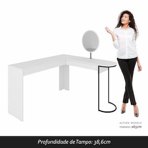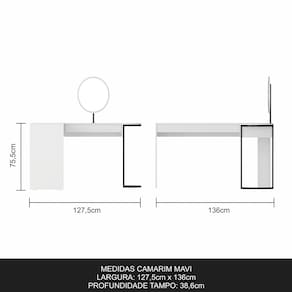 Descrição do Produto Materiais de Fabricação: - Chapa MDP 15mm / MDF 15 MM - Acabamento: Pintura UV e Pintura PU - Estrutura: Metalon - Corrediças Metálica - Possuiu 1 gaveta - A gaveta suporta até 2 kg - Acompanha espelho e Led - Tonalidade escrivaninha: Branco- Tonalidade estrutura: Preto Fosco - Estruturado com material de altíssima qualidade, evitando fungos e mofo.