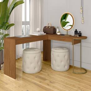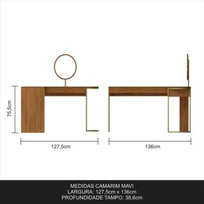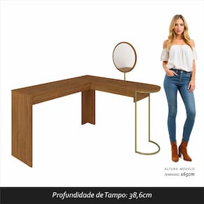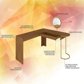 Descrição do Produto Materiais de Fabricação: - Chapa MDP 15mm / MDF 15 MM - Acabamento: Pintura UV e Pintura PU - Estrutura: Metalon - Corrediças Metálica - Possuiu 1 gaveta - A gaveta suporta até 2 kg - Acompanha espelho e Led - Tonalidade escrivaninha: Freijó- Tonalidade estrutura: Dourado - Estruturado com material de altíssima qualidade, evitando fungos e mofo.