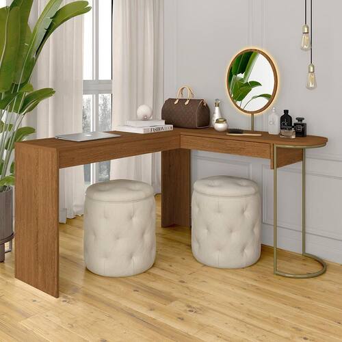 Camarim Industrial em L com Led e espelho Oval Mavi é uma peça versátil e elegante, ideal para quem busca praticidade. O espelho integrado com Led é um bônus que a torna perfeita para momentos de autocuidado.