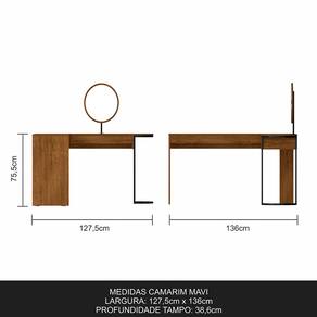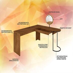 Descrição do Produto Materiais de Fabricação: - Chapa MDP 15mm / MDF 15 MM - Acabamento: Pintura UV e Pintura PU - Estrutura: Metalon - Corrediças Metálica - Possuiu 1 gaveta - A gaveta suporta até 2 kg - Acompanha espelho e Led - Tonalidade escrivaninha: Freijó- Tonalidade estrutura: Preto Fosco - Estruturado com material de altíssima qualidade, evitando fungos e mofo.