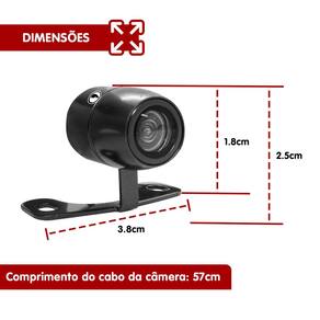 CARACTERÍSTICAS: - Design Versátil: Pode ser instalada no formato borboleta (tartaruga) ou diretamente no para-choque. - Instalação Prática: Acompanha Serra-Copo para facilitar o encaixe no para-choque. - Qualidade de Imagem: Resolução de 480p com lente em vidro, garantindo boa definição. - Ângulo de Visão: Amplo campo de 90°, proporcionando maior segurança nas manobras. - Resistência à Água, assegurando funcionamento mesmo em condições adversas. - Compatibilidade Universal: Funciona em veículos de 4 rodas com alimentação entre 9V e 16V.