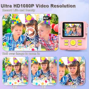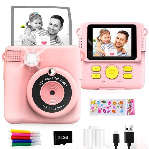 -?Melhor presente de brinquedo para crianças?Nossa câmera digital de impressão instantânea é uma ótima opção como presente de aniversário ou Natal para crianças de 3 a 12 anos. Com gravação de vídeo HD 1080P e zoom digital 16X, as crianças podem ter uma visão maior e mais clara para registrar o precioso tempo da infância. Lembre-se de instalar um cartão SD de 32G com antecedência, o que permite armazenar centenas de fotos e vídeos. Ele também tem 14 tipos de filtros de cena e 18 tipos de adesivos, o que é muito engraçado para todas as crianças quando elas tiram fotos ou selfies.